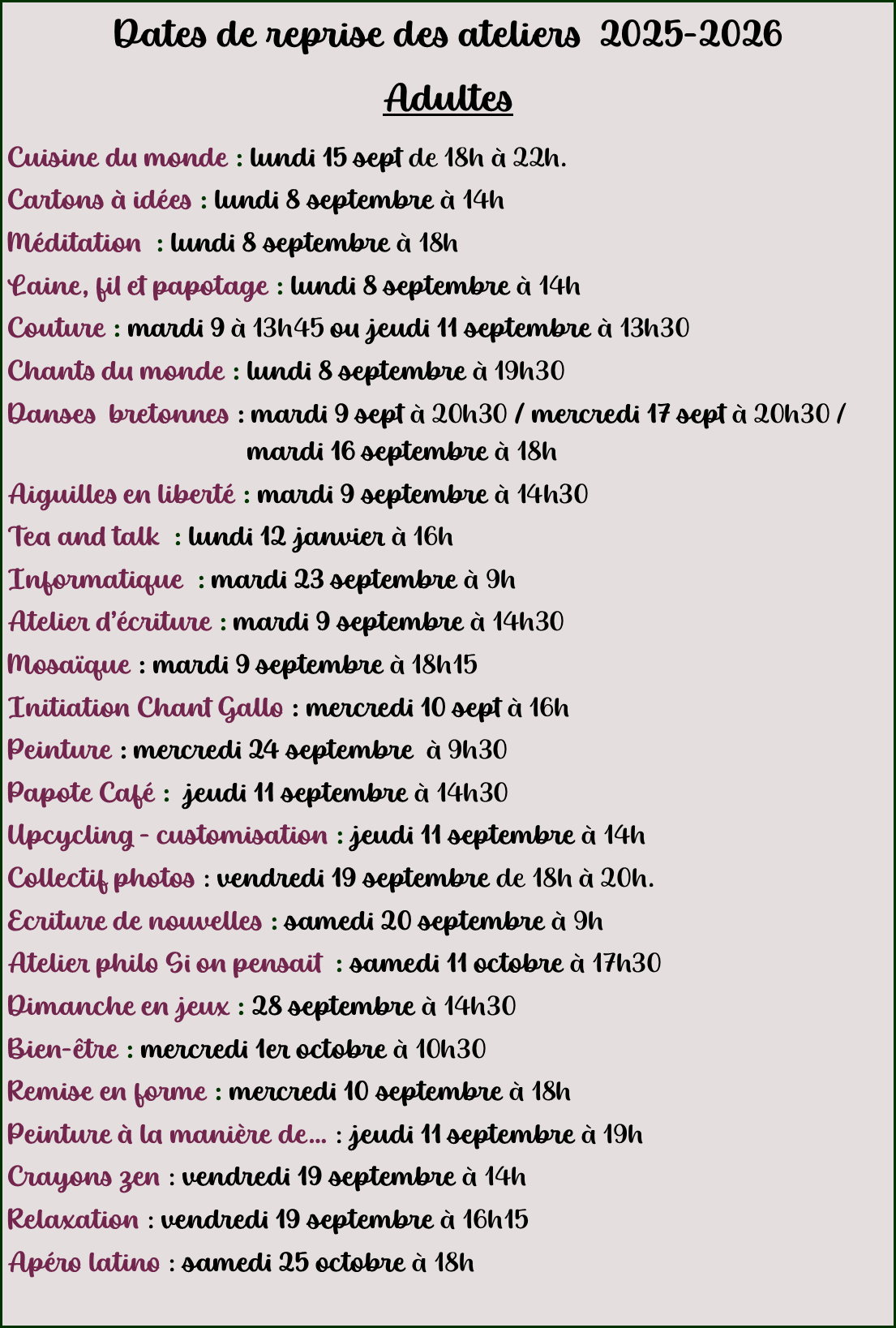 Voici un document qui récapitule les dates de reprise de chaque atelier.