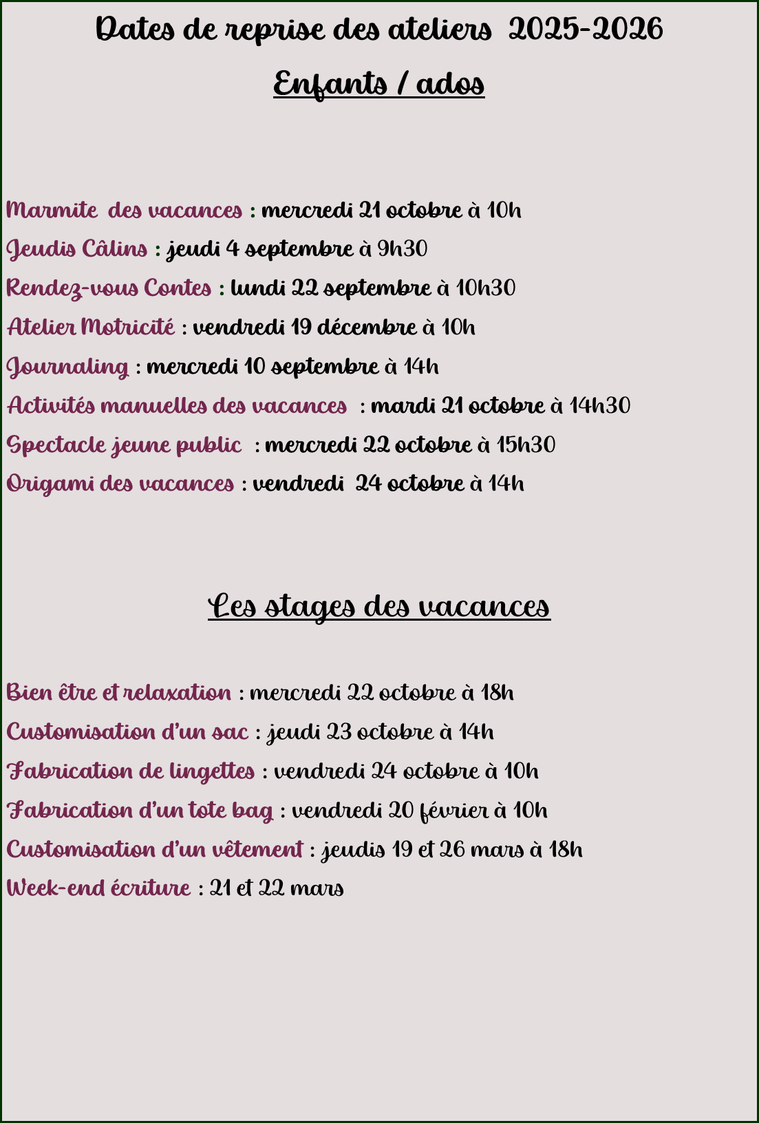 Pour les ateliers enfants/ados et les stages, c’est ICI.